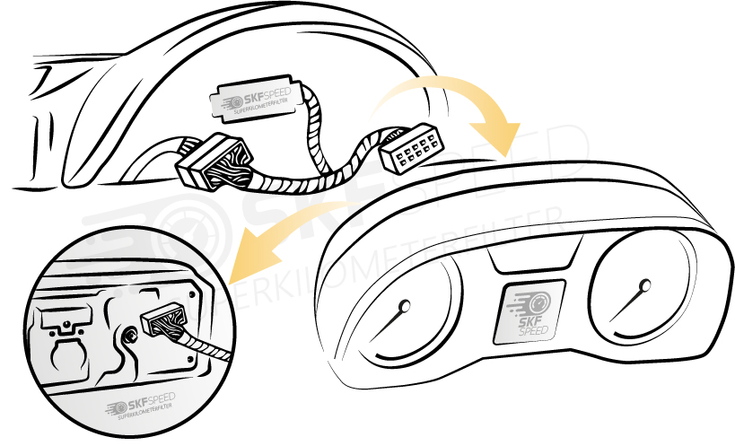 In most cases, it is enough to loosen a few screws and nuts and remove the inner panel. Hence, you will need the basic tools to remove the speedometer. After dismantling, insert the Mileage Blocker between the speedometer and the cable that you have pulled out of the instrument cluster. Even if the connectors are connected incorrectly, the electronic system will not be damaged. Thanks to its user-friendliness, you can quickly and easily manage the settings of the Kilometer Blocker and make necessary changes when you want to switch it on or off. The Speedometer Stopper can be conveniently operated using the keys situated on the steering wheel, or with the appropriate application, our SKF Speed APP.